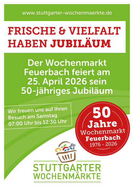 Am 25. April 2026 von 07:00 bis 12:30 Uhr laden wir Sie herzlich ein, mit uns das 50. Jubiläum unseres Wochenmarktes Feuerbach zu feiern! Ein ganz besonderer Tag mit tollen Angeboten und exklusiven Aktionen erwartet Sie.