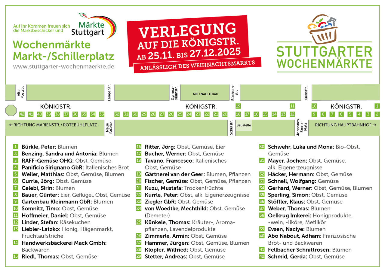 den EinkaufskorbIn Stuttgart gibt es 32 Wochenmärkte. Die Markttage sind auf Dienstag bis Samstag festgelegt. Fast jedes Viertel hat seinen Wochenmarkt. Man kennt sich, grüßt sich und wer mag, findet genügend Zeit für ein „Schwätzle“. Der Gang auf den Wochenmarkt gehört für viele Familien zu einer gepflegten Tradition, die in den wöchentlichen Ablauf fest eingeplant ist. Schließlich geben die Händler auch immer gerne Tipps zu aktuellen Produkten und Zubereitungsarten.