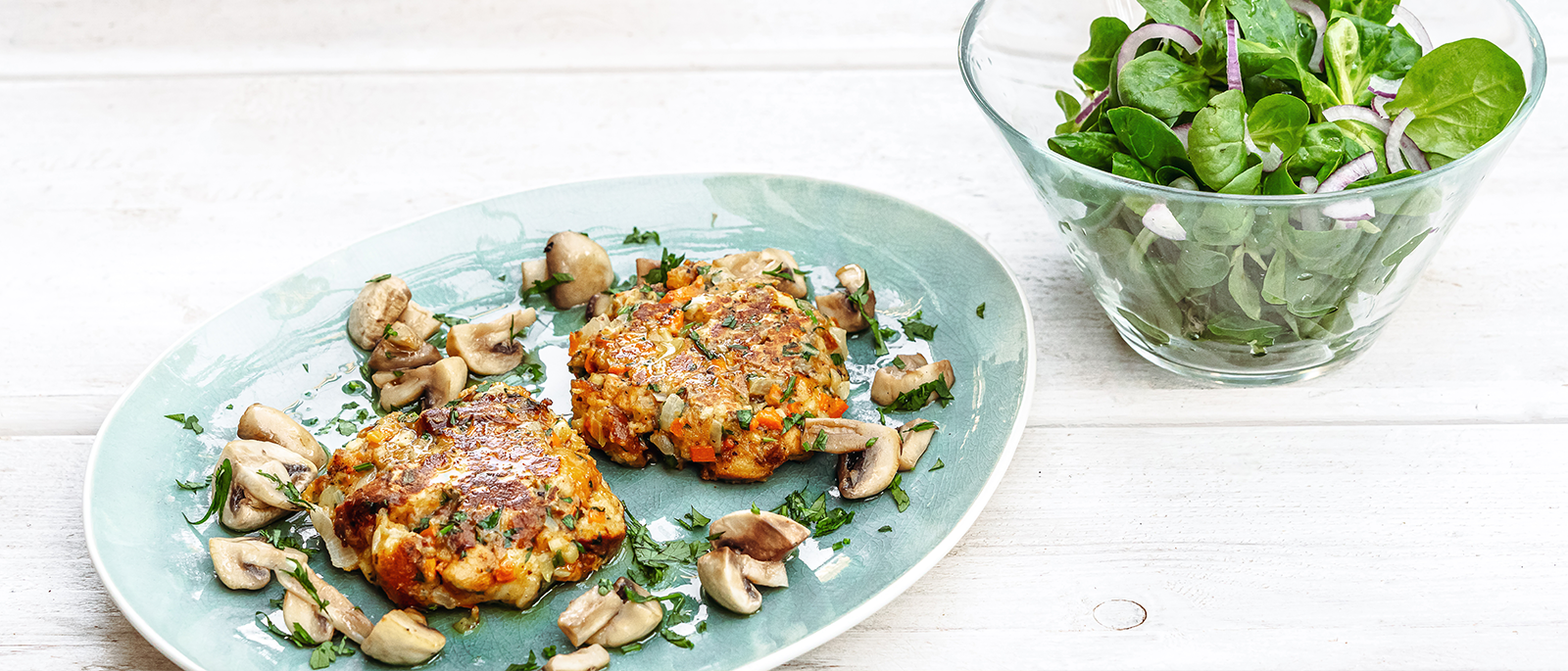 Brezelbratlinge mit sautierten Champignons und Ackersalat