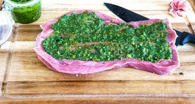 Das Schweinefilet der Länge nach aufschneiden, mit Salz und Pfeffer aus der Mühle würzen, dann mit dem Bärlauch-Pesto füllen und das Filet zusammen rollen.