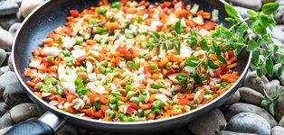 Die Champignons putzen, von den Stielen befreien und etwas aushöhlen. Die Stiele und das ausgehöhlte Champignonfleisch klein hacken. Ebenso die Spitz-Paprika in kleine Würfeln schneiden und die Lauchstangen in dünne Scheiben schneiden.