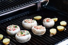 Die gefüllten Champignons nun auf ein Backblech oder auf den Grill setzen und bei ca. 180 Grad fertig backen. In den letzten 5 Minuten mit den Camembert-Scheiben belegen und überbacken lassen.